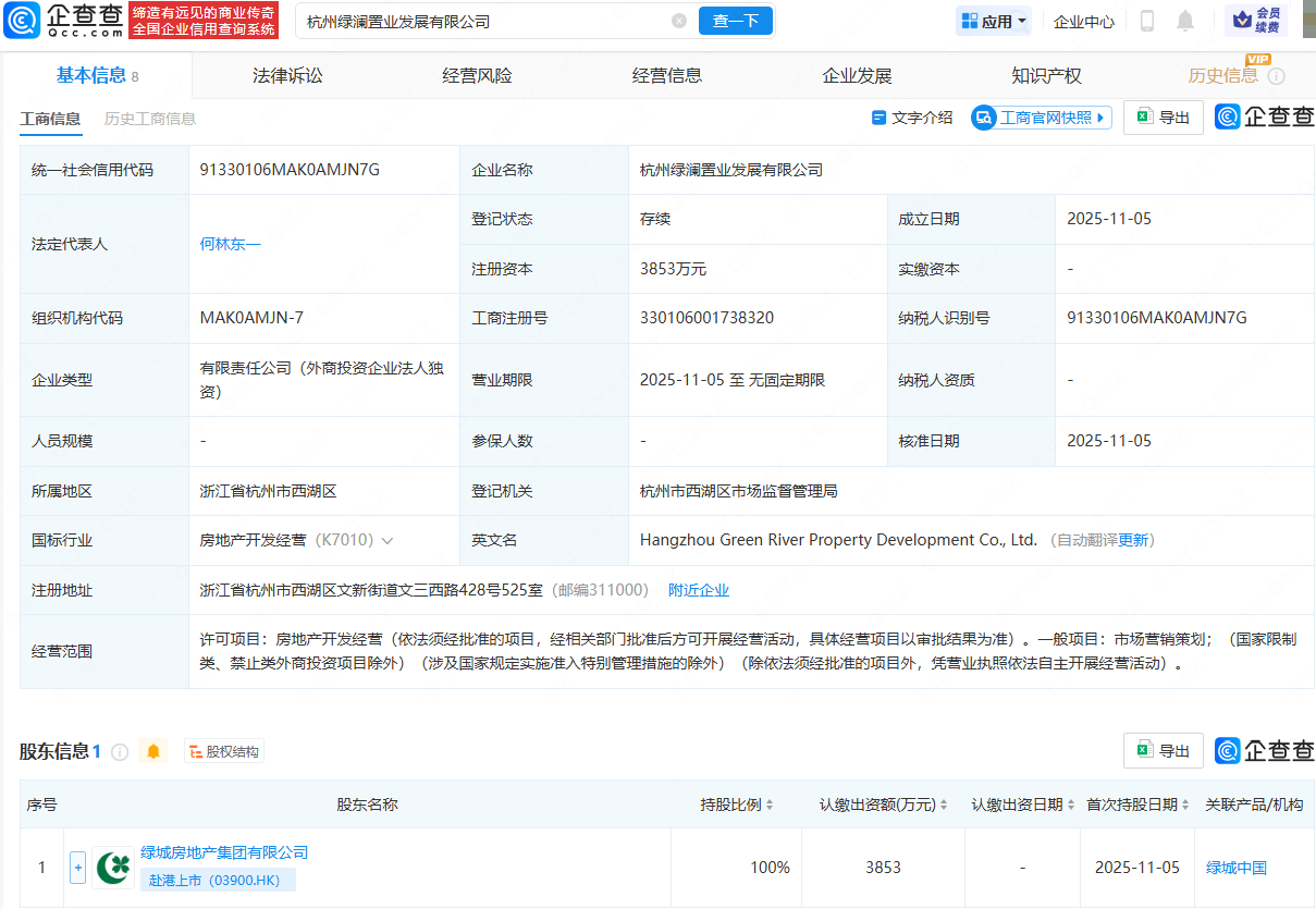 近日配资开户服务,杭州绿澜置业发展有限公司成立,法定代表人为何林东一,注册资本为3853万元,经营范围包含:房地产开发经营;市场营销策划。企查查股权穿透显示,该公司由绿城房地产集团有限公司全资持股。