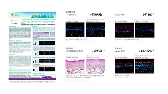 2023年,崭露头角的专利抗老成分组「塑立肽」,INGS英树在国际IFSCC大会上首次发表《探索多肽组合在逆转衰老和氧化应激中的作用》相关论文,论证ADJ peptides™塑立肽在促生胶原、御光抗氧方面的突出功效。