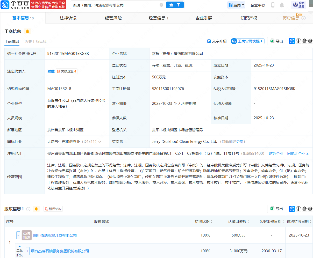 近日,杰瑞(贵州)清洁能源有限公司成立如何选择合适的股票配资平台,法定代表人为谢猛,经营范围包含:燃气经营;矿产资源勘查;陆地石油和天然气开采;发电业务、输电业务、供(配)电业务等。企查查股权穿透显示,该公司由杰瑞股份(002353)间接全资持股。